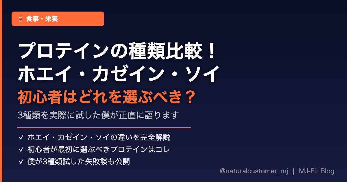 「プロテインを買おうと思ったんだけど、種類が多すぎて何を選べばいいかわからない…」そんな悩みを持っている人、めちゃくちゃ多いと思う。実は僕も最初は完全に迷子だった。この記事ではホエイ・カゼイン・ソイの3種類を徹底比較して、初心者が最初に選ぶべきプロテインをズバリ答えるよ。