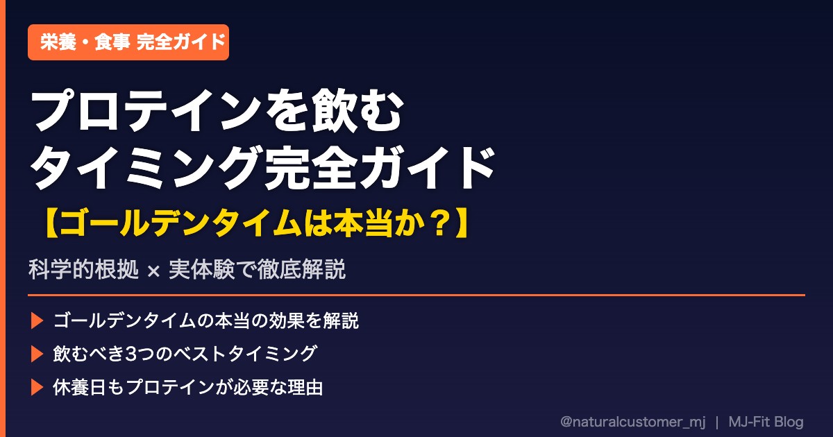 「プロテインっていつ飲めばいいの?」これ、筋トレを始めたばかりの頃に俺が一番悩んだことだ。ネットで調べると「トレ後30分以内が絶対」「ゴールデンタイムを逃すな」みたいな情報が溢れてて、正直混乱した記憶がある。この記事では、研究結果と俺の実体験を交えながら、プロテインを飲む最適なタイミングを完全解説する。読み終えれば、もう迷わなくなるはずだ。